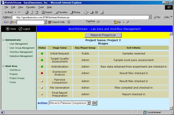BioInfoStream is a biotech lab data and workflow management software system. It is an integrated Collaborative Commerce (C-Commerce) bioinformatics software system. The following screenshot is a sample project that streamlines the microarray analysis workflow by allowing cross-department/cross-enterprise data sharing and collaboration.